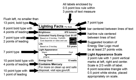 新规则增加了对一些灯泡的标签要求,如一般服务灯的流明和汞标识。对于B,BA,F和G-型的装饰灯,新规则允许无需在灯泡上标注流明信息,但必须保留汞标识,以确保消费者通过这些信息合适清理回收。